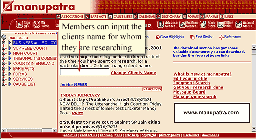 Under the provision of knowing one's own account of manupatra usage, members can keep a track of how much they are researching for a client by putting in the name of the client on the personalized Home Page, as shown below. |